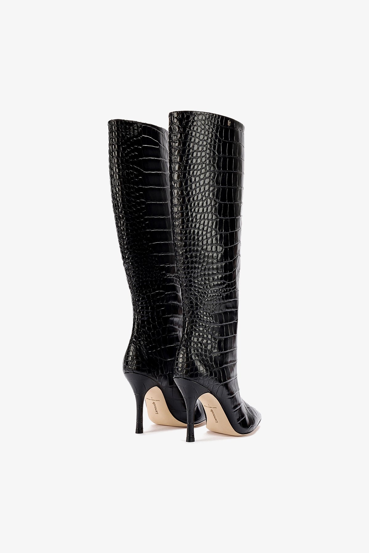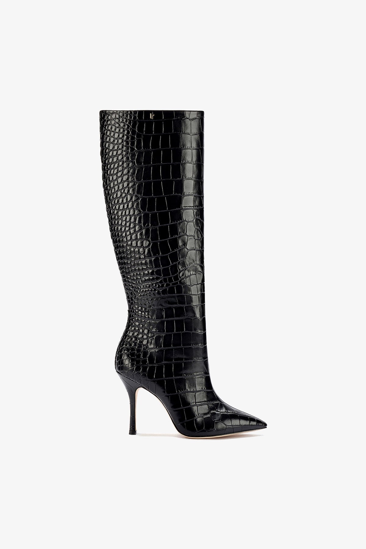 Crafted from the most beautifully textured shiny stamped leather, this classic heeled boot is anything but boring. The sleek Larroudé style that elongates a woman's silhouette is one you'll want to show off.