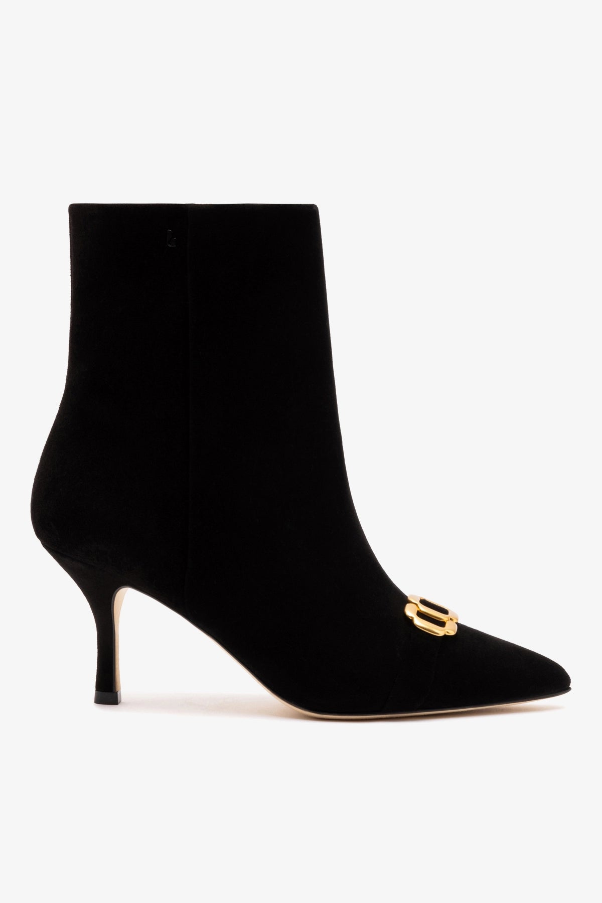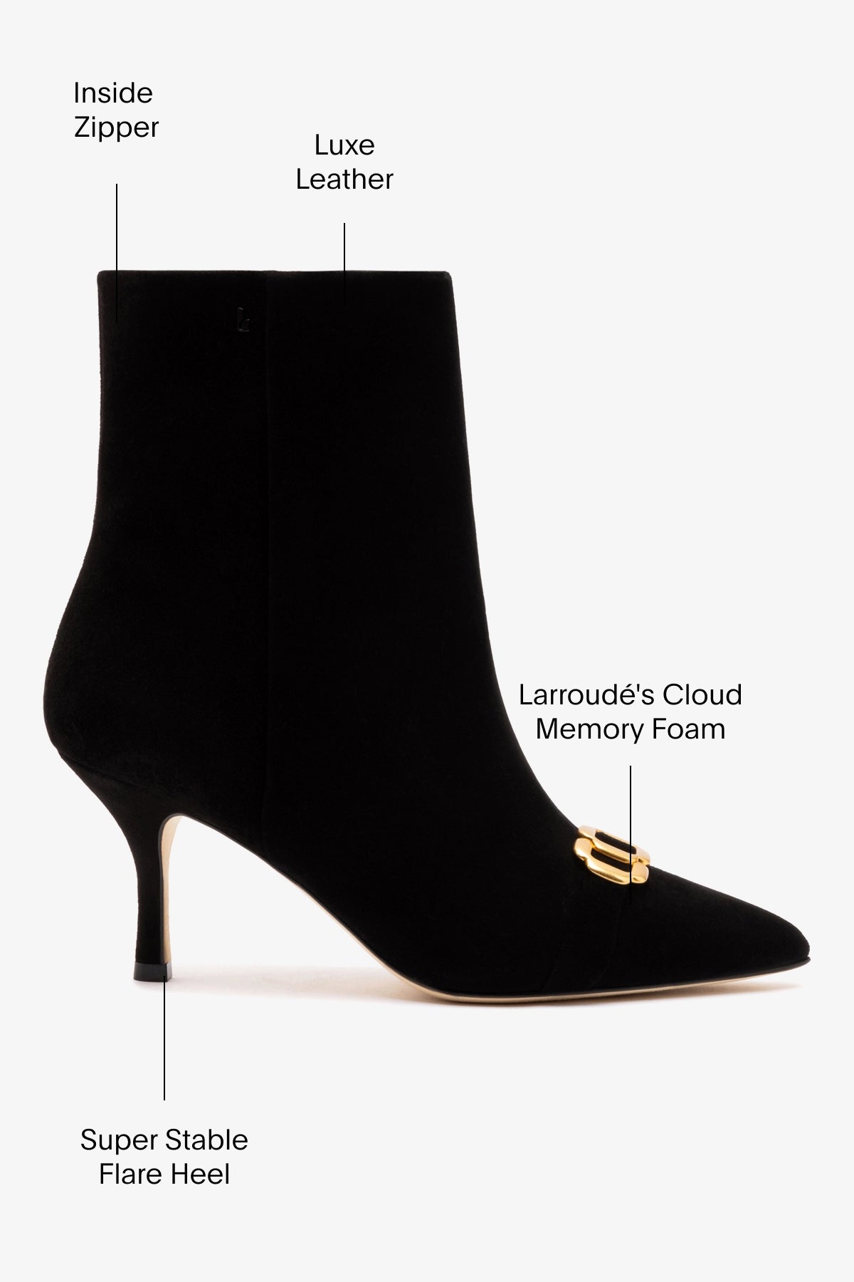 Based off the sleek style—and sex appeal—of our bestselling Kate boot, the Mini Kate is the latest and greatest addition to the line-up. With the same pointed toe, luxe black leather, gold hardware adornment at the toe, and super flattering (yet comfortable) heel height, this abridged boot hits right above the ankle for a cute cut that we love with dresses and minis.