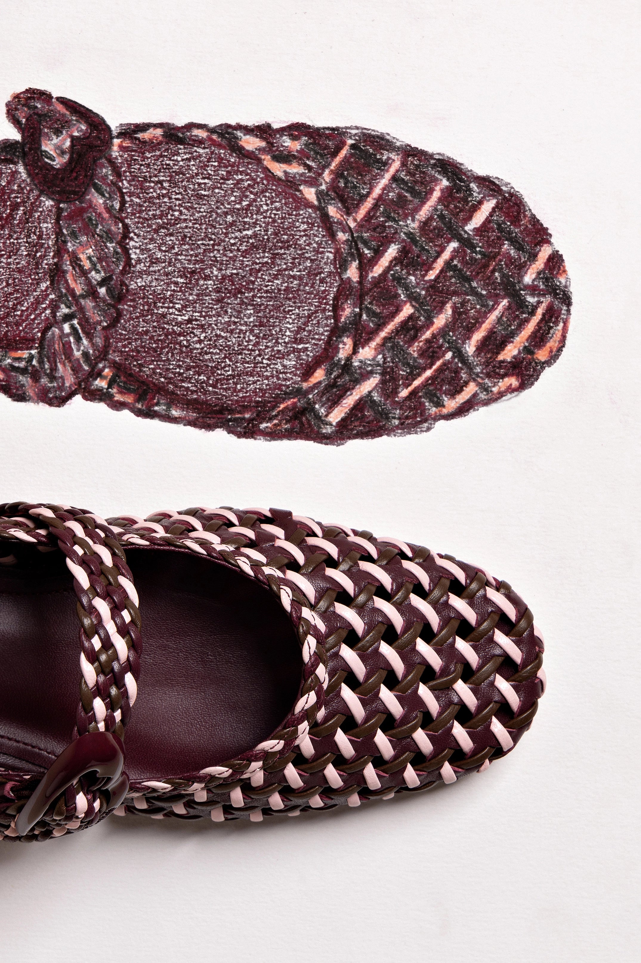 Our most comfortable flat yet, our newest Verona mary-jane takes cues from a Shakespearean romance. In an intricate woven macrame of wine, tulip and burnt umber leathers—along with a tonal heart buckle at the strap—this pair is a dimensional addition to the collection.