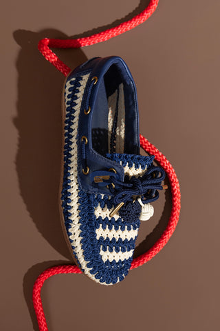 Cyprus Crochet Boat Shoe In Navy and Ivory Crochet and Navy Leather