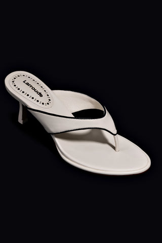 We took the classic thong flip flop to new heights for High Summer with our new Gaia Sandal. In an ivory leather with black trim, this is the one that brings added attitude and style to any look day or night.