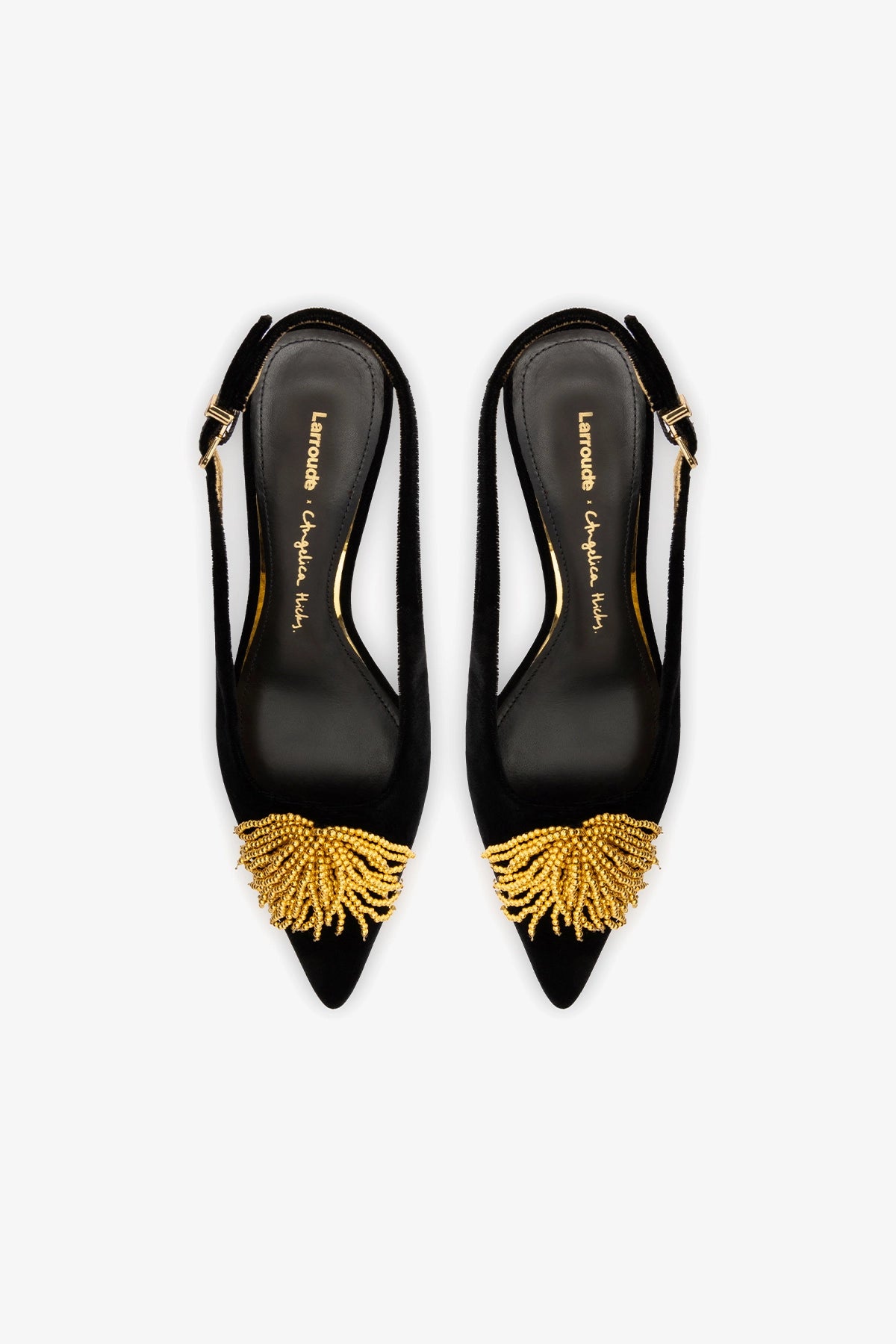 One of the sharpest wits in contemporary art and fashion, Angelica Hicks brings her bold, humorous vision to Larroudé. A show-stopping piece that moves with you, the Beaded Pump Lo features hand-embroidered gold bead fringes that catch the light with every step. Set on a sleek kitten heel and crafted in rich black velvet, it brings instant glamour to any look—proof that elegance lives in the details.