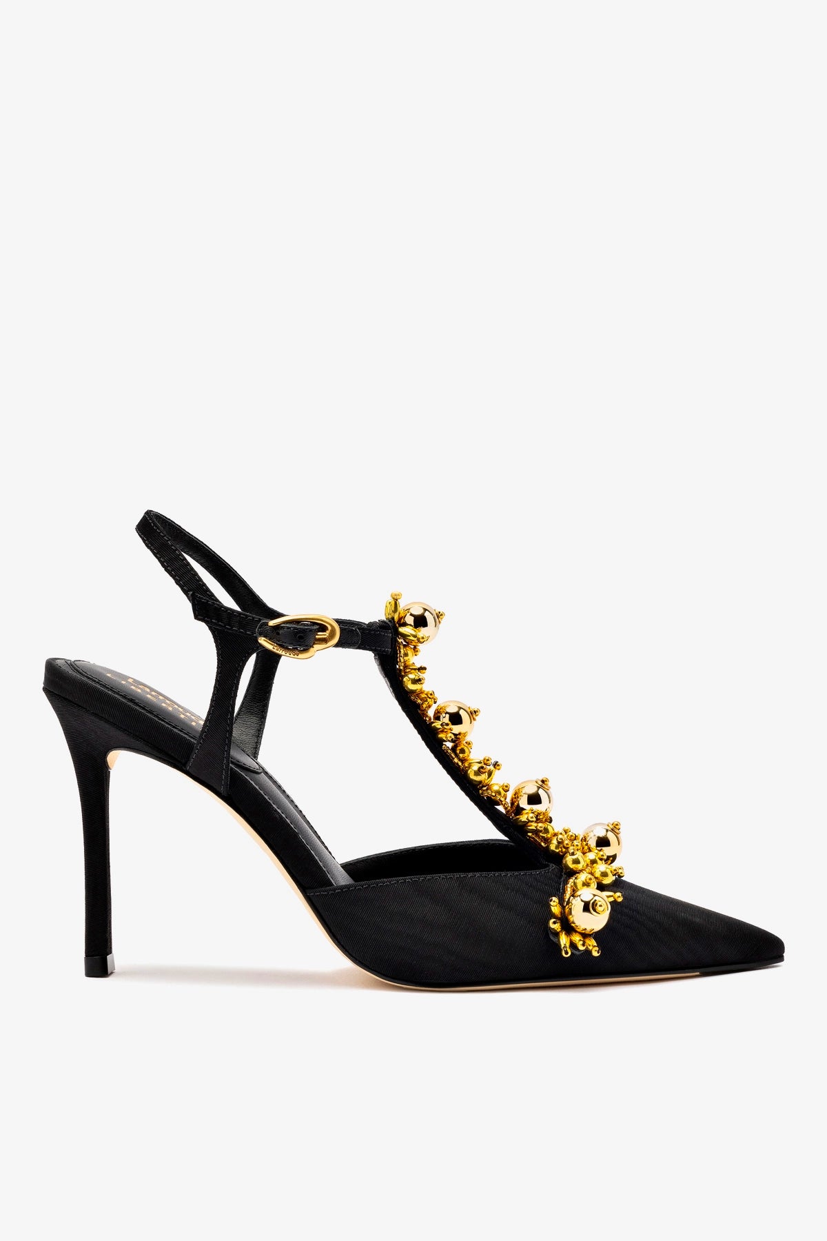 A vivid reimagining of our signature pumps, this newest pair combines punk rock edge and couture sensibility to adorn one of Larroudé's signature silhouettes. Adorned with ornamental gold balls that snake down the front of the shoe, the effect is eye-catching and compels a second look.