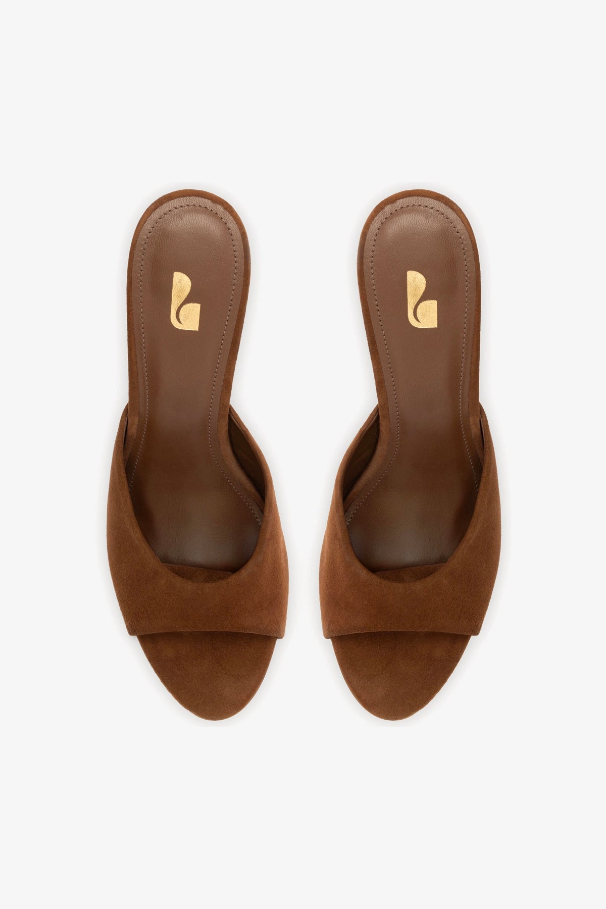 With a retro look and feel, the Jasmine Hi Mule in a rich brown suede is one of the season's most versatile new styles, featuring a soft leather lining, deceptively comfortable sky-high heel, and an elegant peep toe silhouette.