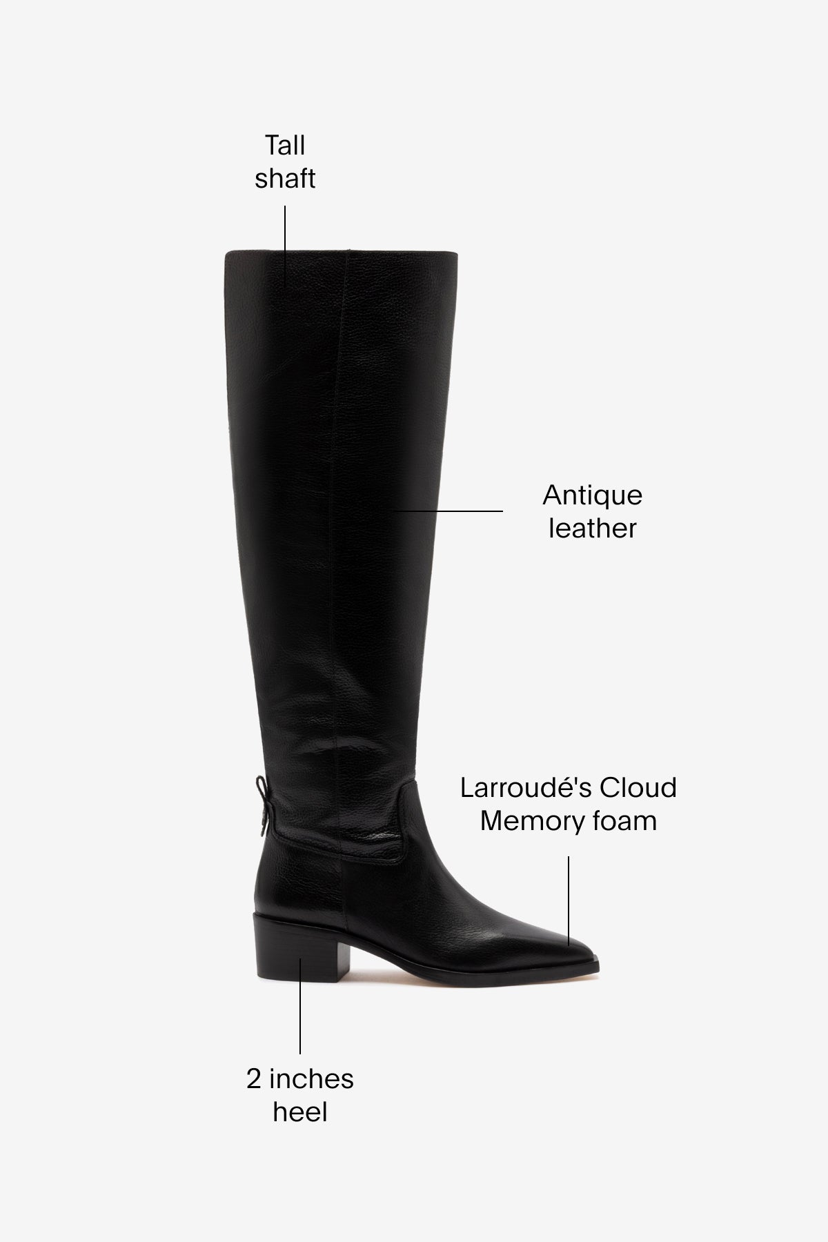 The Florencia Hi boot is the higher-shaft version of our iconic model. With a towering silhouette that hugs the leg like a second skin, this boot in black leather unites the attitude of an over-the-knee shaft with the stability of a low heel, creating a powerful and comfortable look.