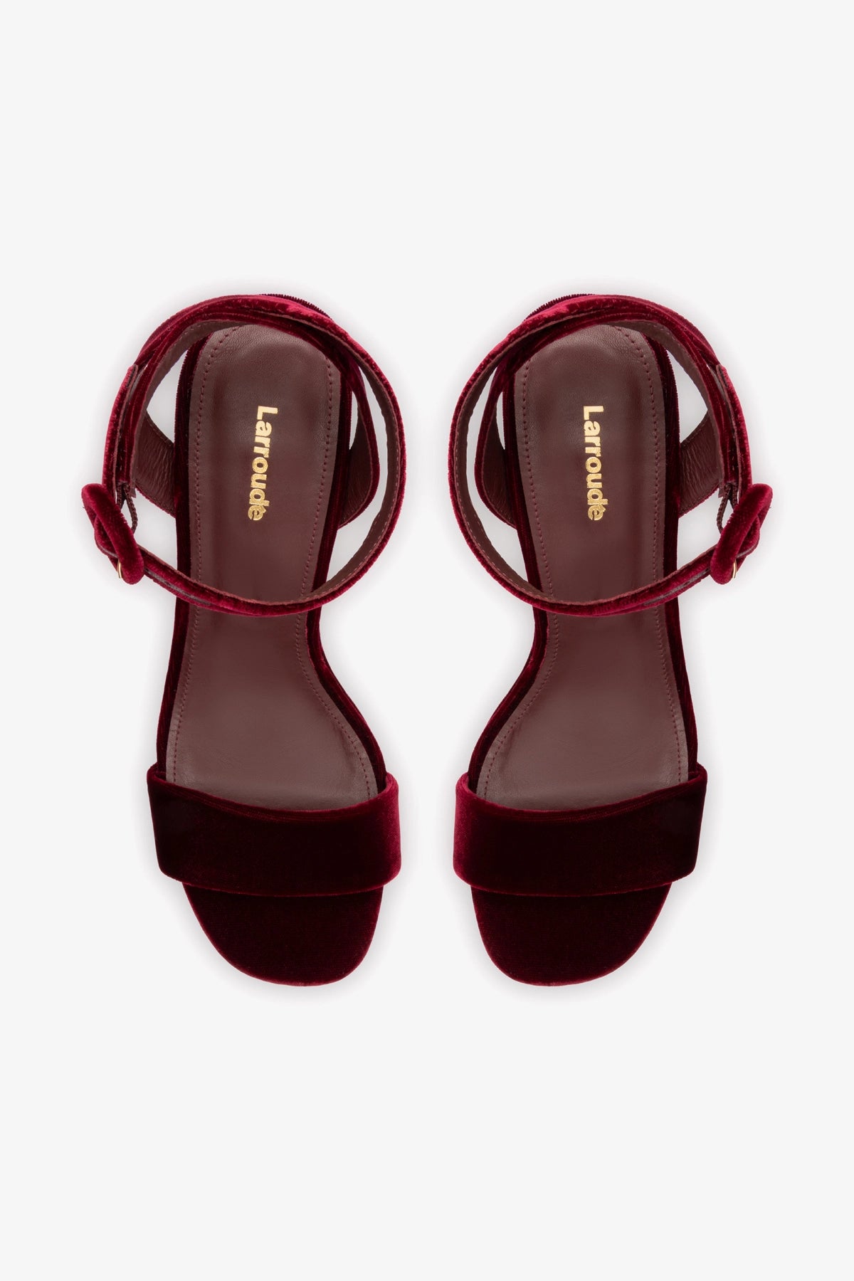 Our iconic Dolly style is back in an irresistible new version. Crafted from luxurious velvet in a rich wine hue, this sandal is a statement of power and style. With its towering block heel and bold platform, it elevates your look and your confidence.
