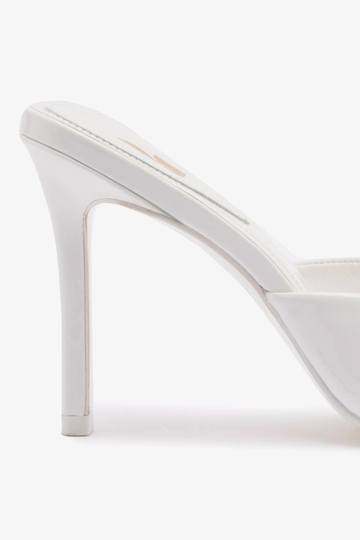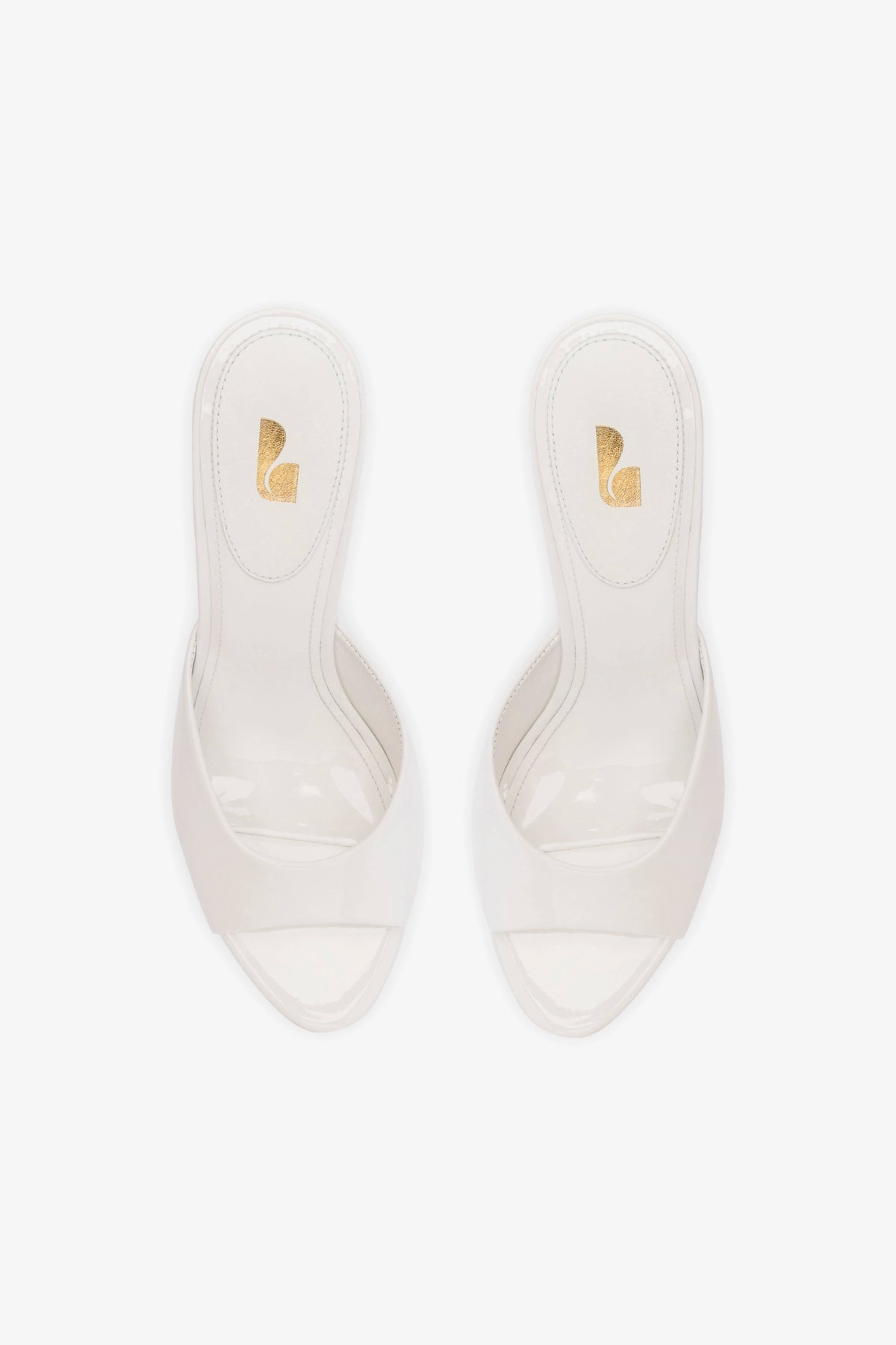 With a retro look and feel, the Jasmine Hi Mule in a bright white patent leather is one of the season's most versatile new styles, featuring a soft leather lining, deceptively comfortable sky-high heel, and an elegant peep toe silhouette.
