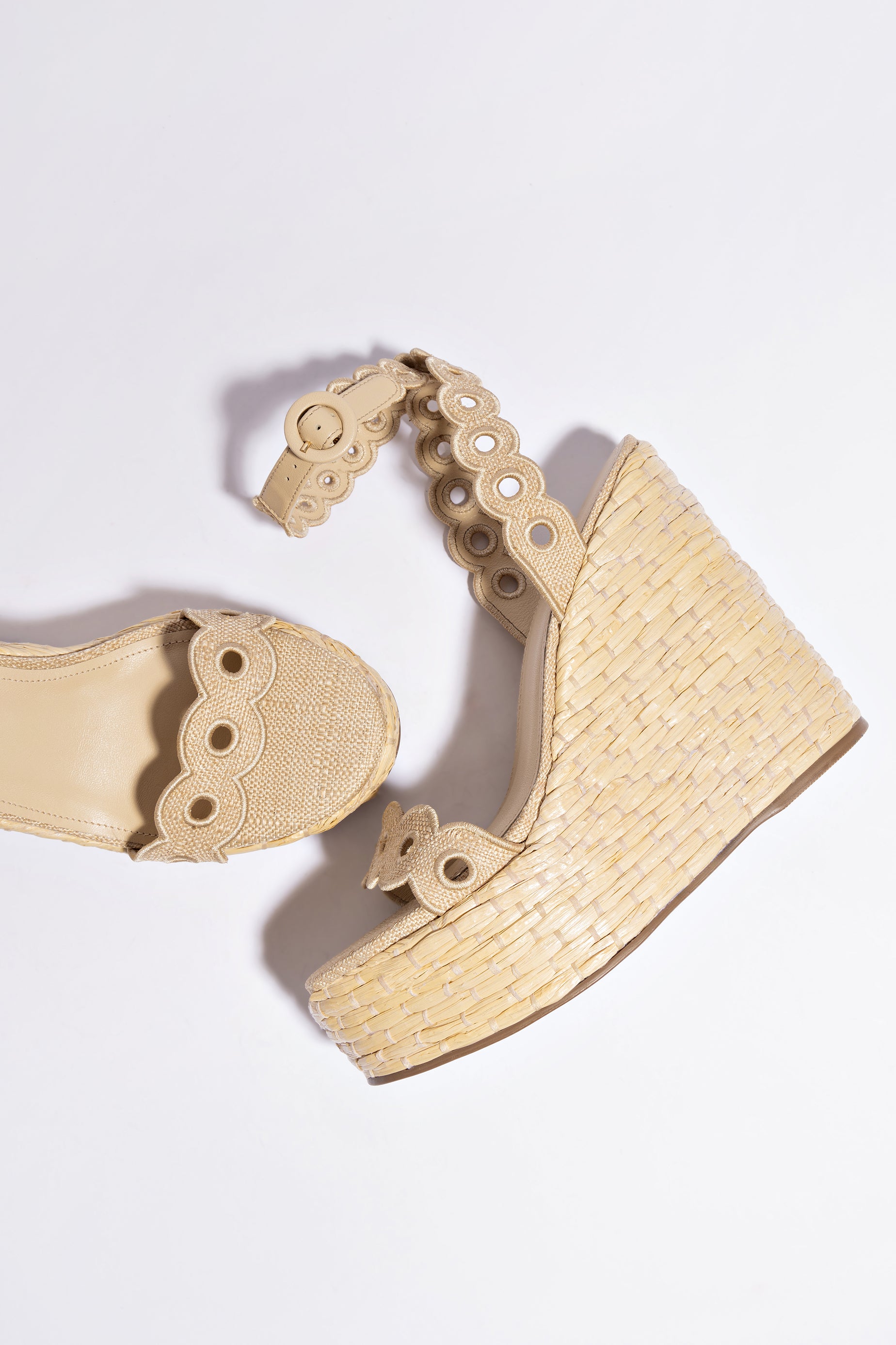 With Spring time on the horizon, we'll always make room for another sandal silhouette, especially when it comes in raffia. These easy-to-wear wedges can be dressed up or down with a delightful broderie design detail that's sweet but not too precious.