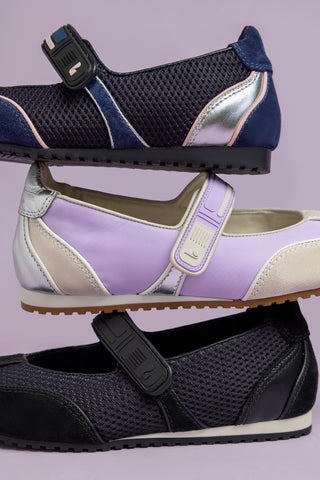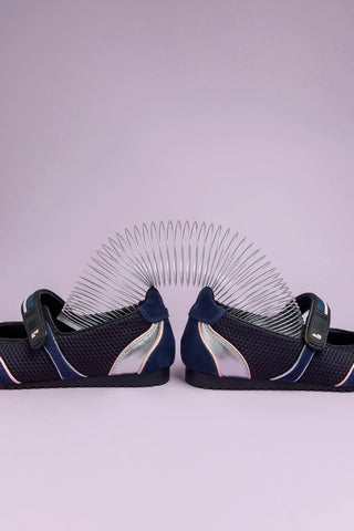 Devon Ballet Flat In Navy Suede, Black Mesh and Silver Metallic Leather