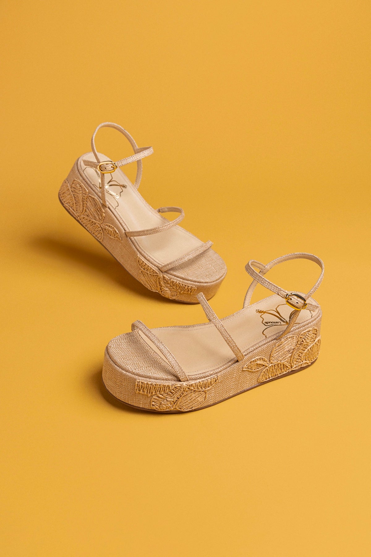 Gio Flatform In Beige Raffia and Hibiscus Embroidery