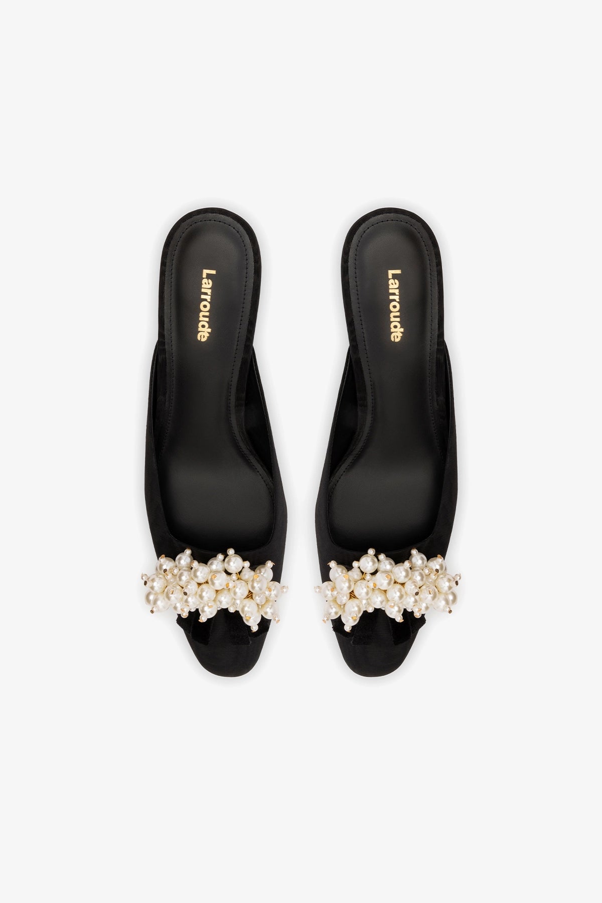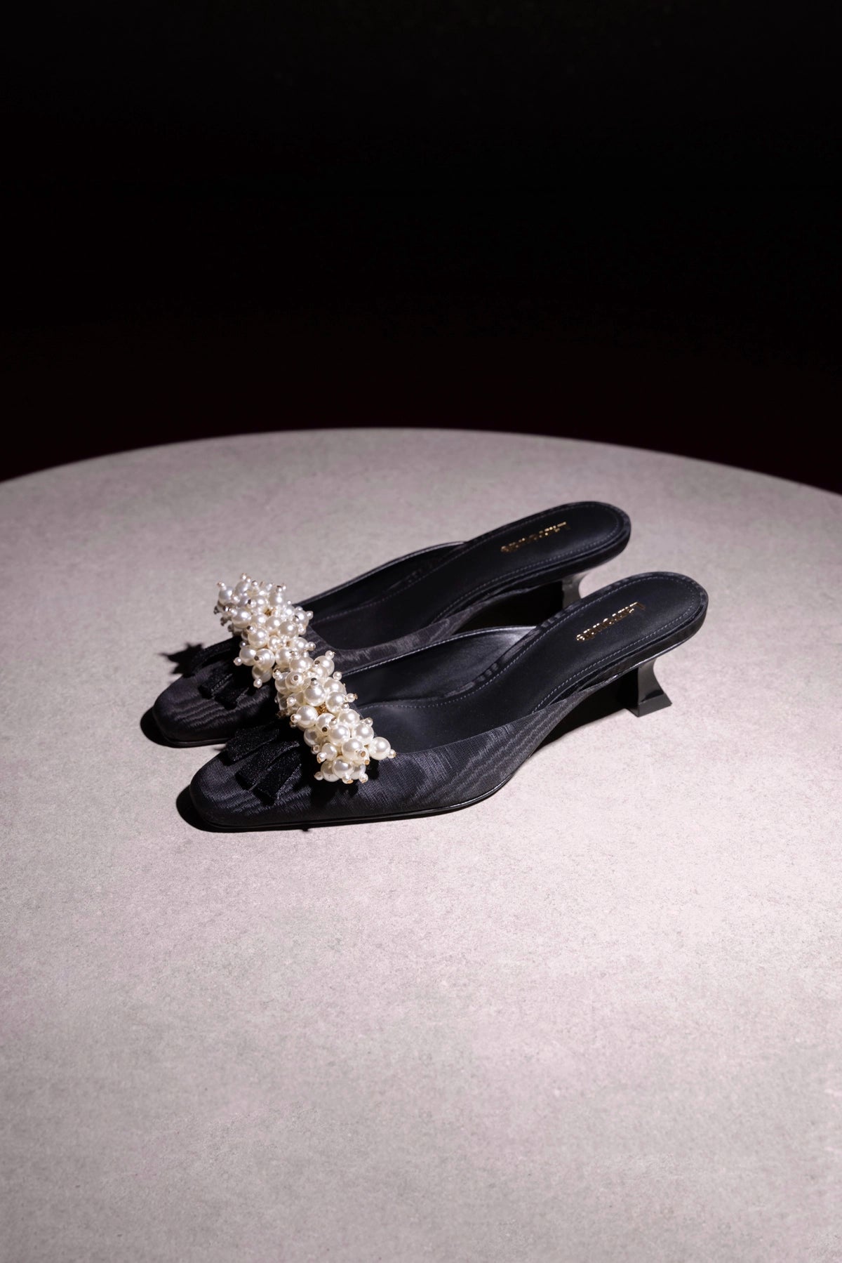 The Amal Mule is reimagined in Moiré silk with a sculptural kitten heel, defining timeless elegance: the stunning pearl appliqué is the jewelry detail that transforms this mule into an essential piece for the festive period.