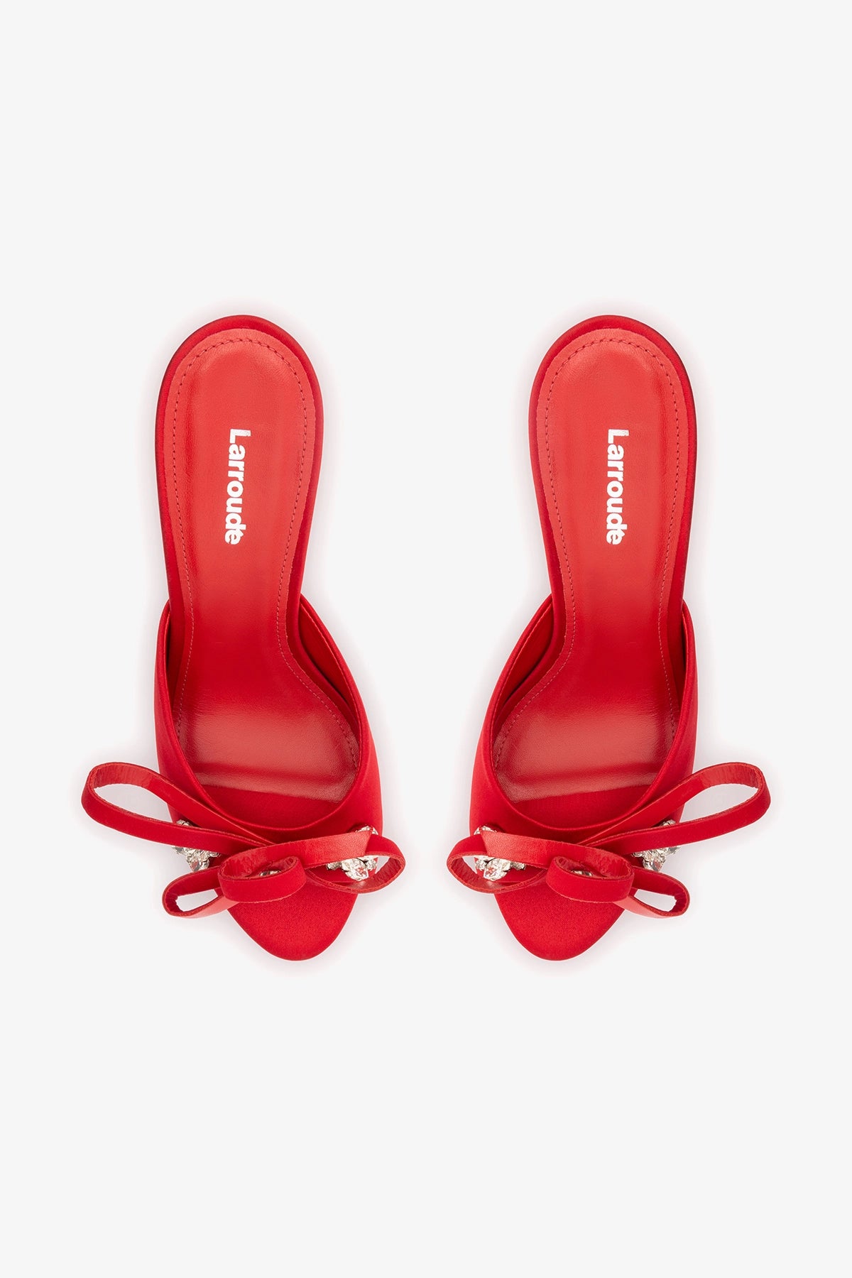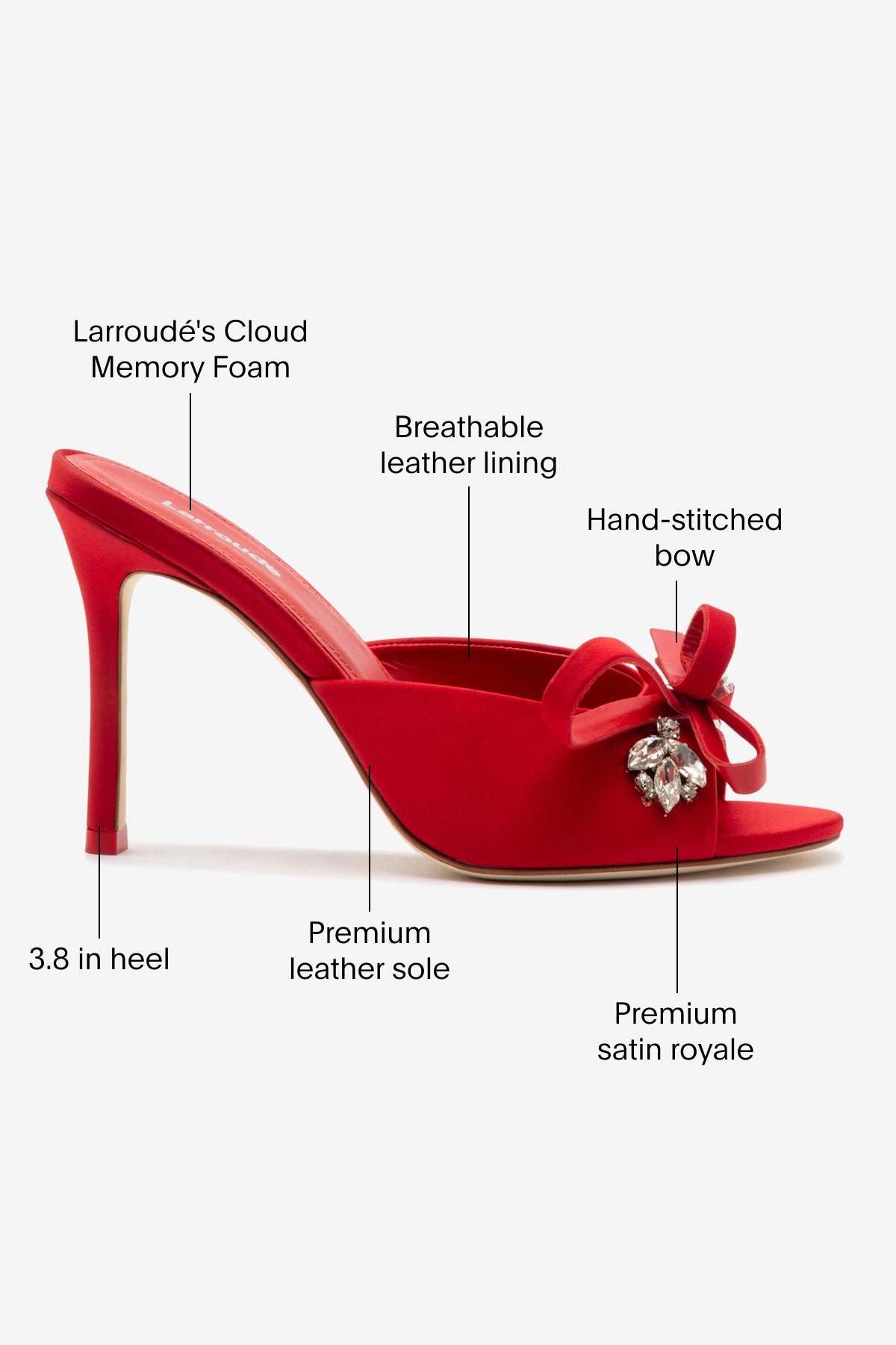 The Rosett Mule—named after the Swedish word for "bow"—is our vision of powerful femininity, reimagined in powerful satin. Featuring a commanding stiletto heel, the shoe is a true jewel: the delicate bow and the shimmering crystals are the finishing touch that defines audacious elegance.