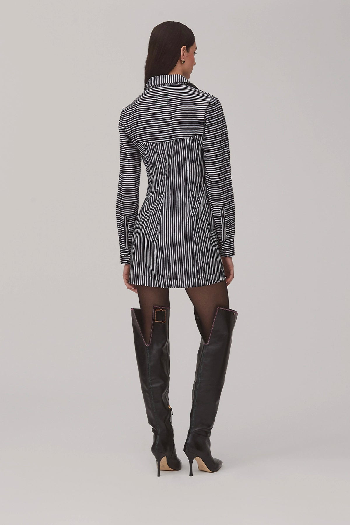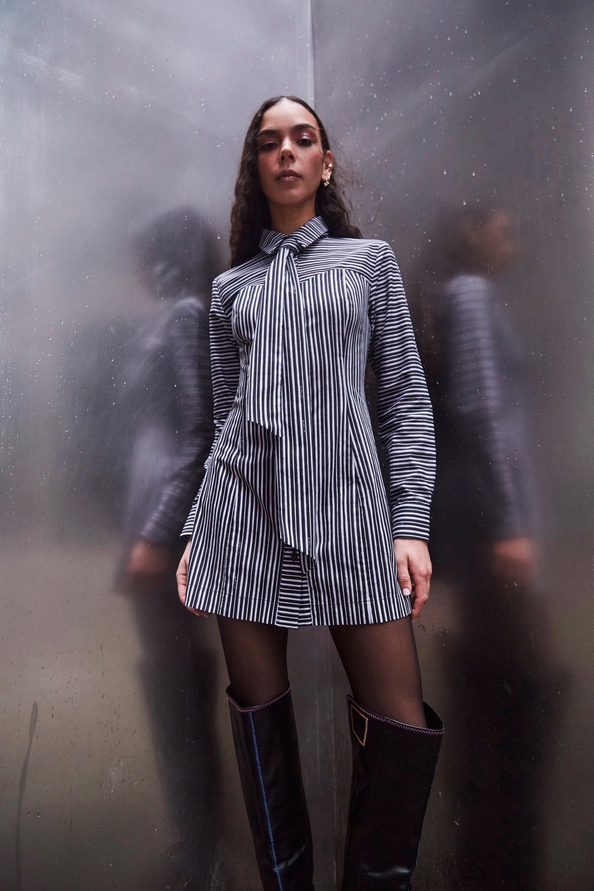 Short dress in black and white striped cotton, designed with a structured upper and a lightweight feel through the body. The mix of vertical and horizontal stripes creates visual interest while maintaining a balanced, flattering silhouette.