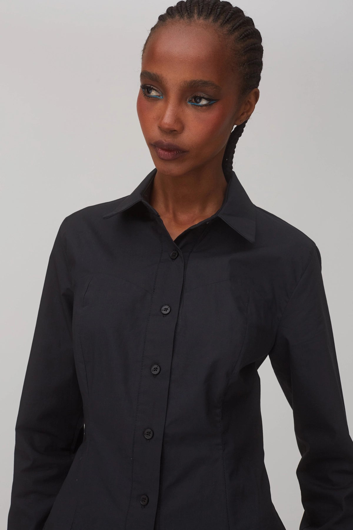 Bustier top in black percale, designed with a structured fit and a clean, minimalist finish. The streamlined silhouette flatters the body while offering versatility for different styling options.