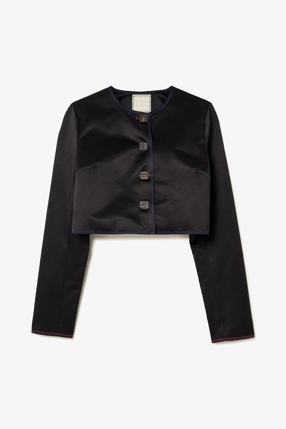 Cropped satin jacket in black, designed with a lightweight structure and clean finish. The straight silhouette offers a balanced fit, while the cropped length adds a modern, versatile touch to everyday looks.