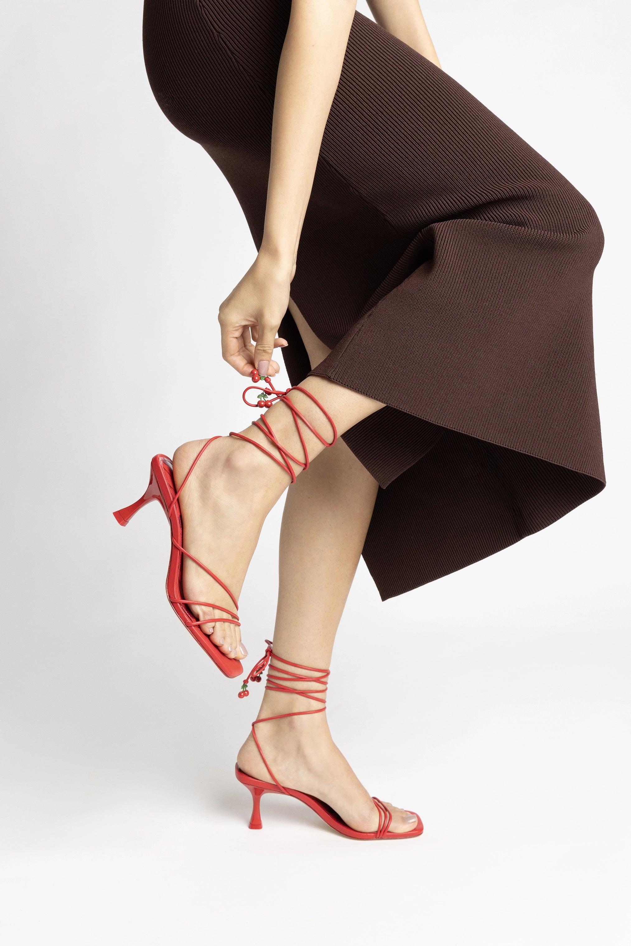 A barely-there sandal with charm to spare, the Nadia is a delightful new addition to High Summer. Barely-there straps atop a kitten heel wrap around the ankle any which way, with playful cherry charms that dangle off the ends that can be featured front or as a lasting impression in the back.