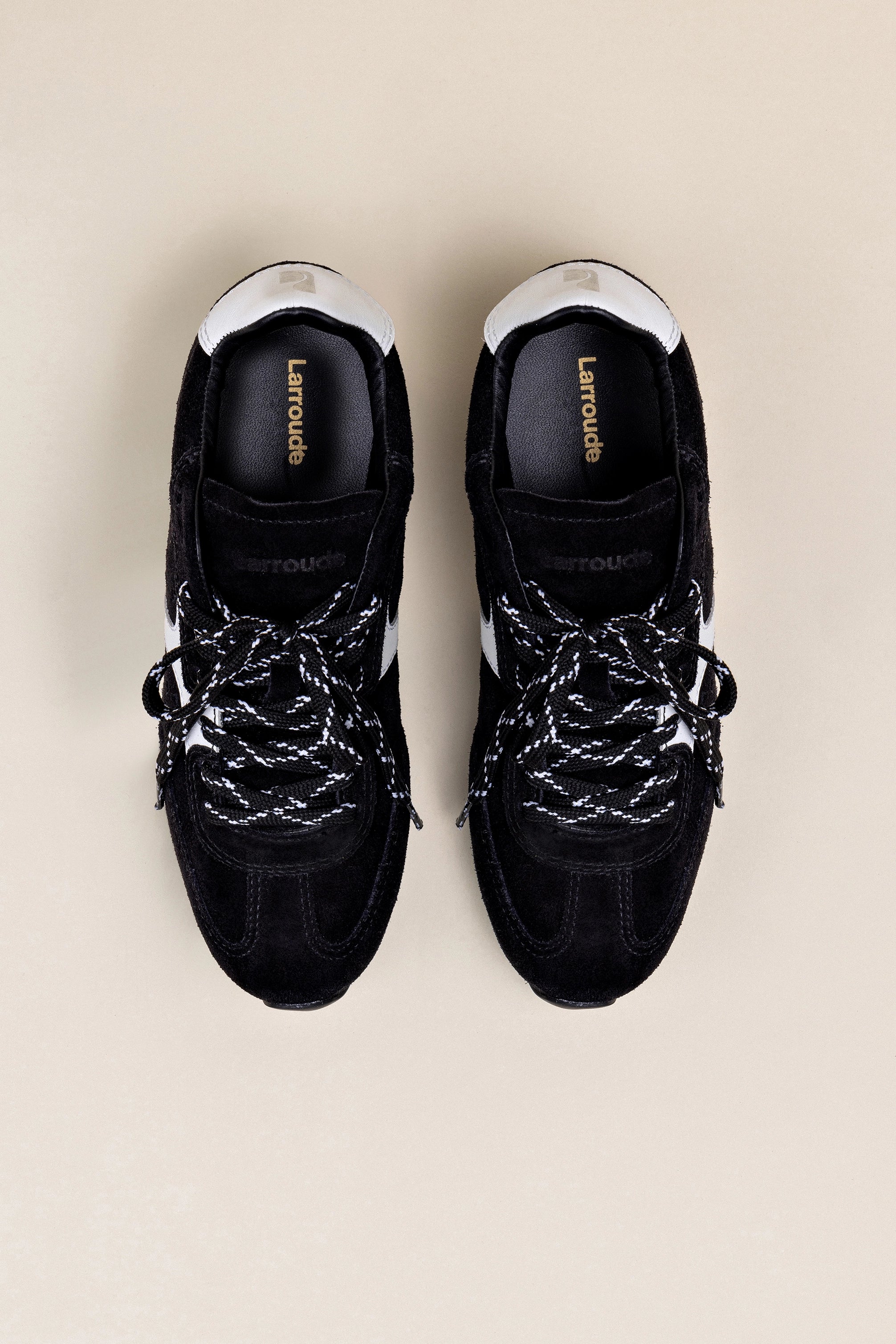We're in our athletic era. Introducing the very first sneaker by Larroudé, the Stella blends functionality and form with fashion, in a super sleek jet black suede that you can wear with anything from day dresses and denim to workout gear at the gym.