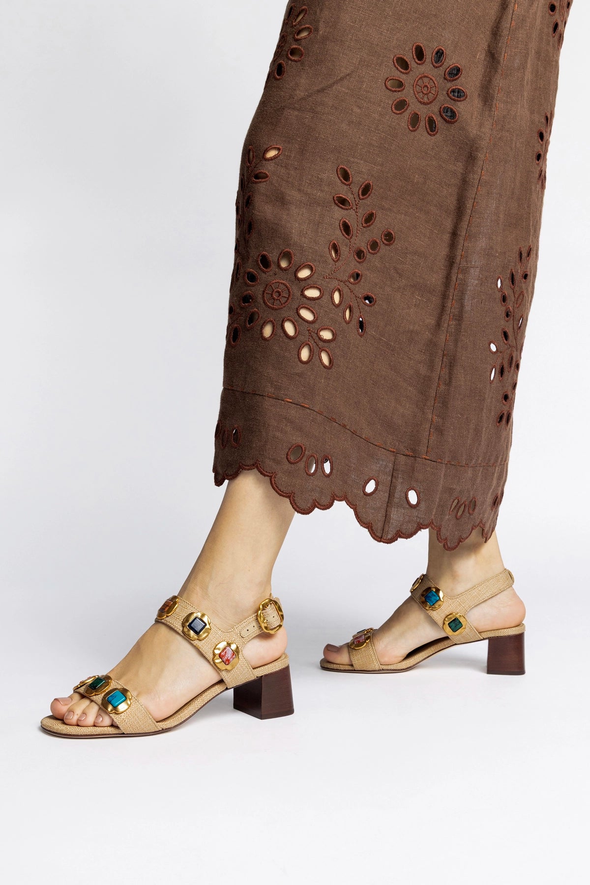 The Milan Gioiello block sandal blends a striking silhouette with artisan-inspired details that stand out naturally. Crafted in soft raffia, it features gold-toned accents set with colorful stones, creating a vibrant, eye-catching look.
