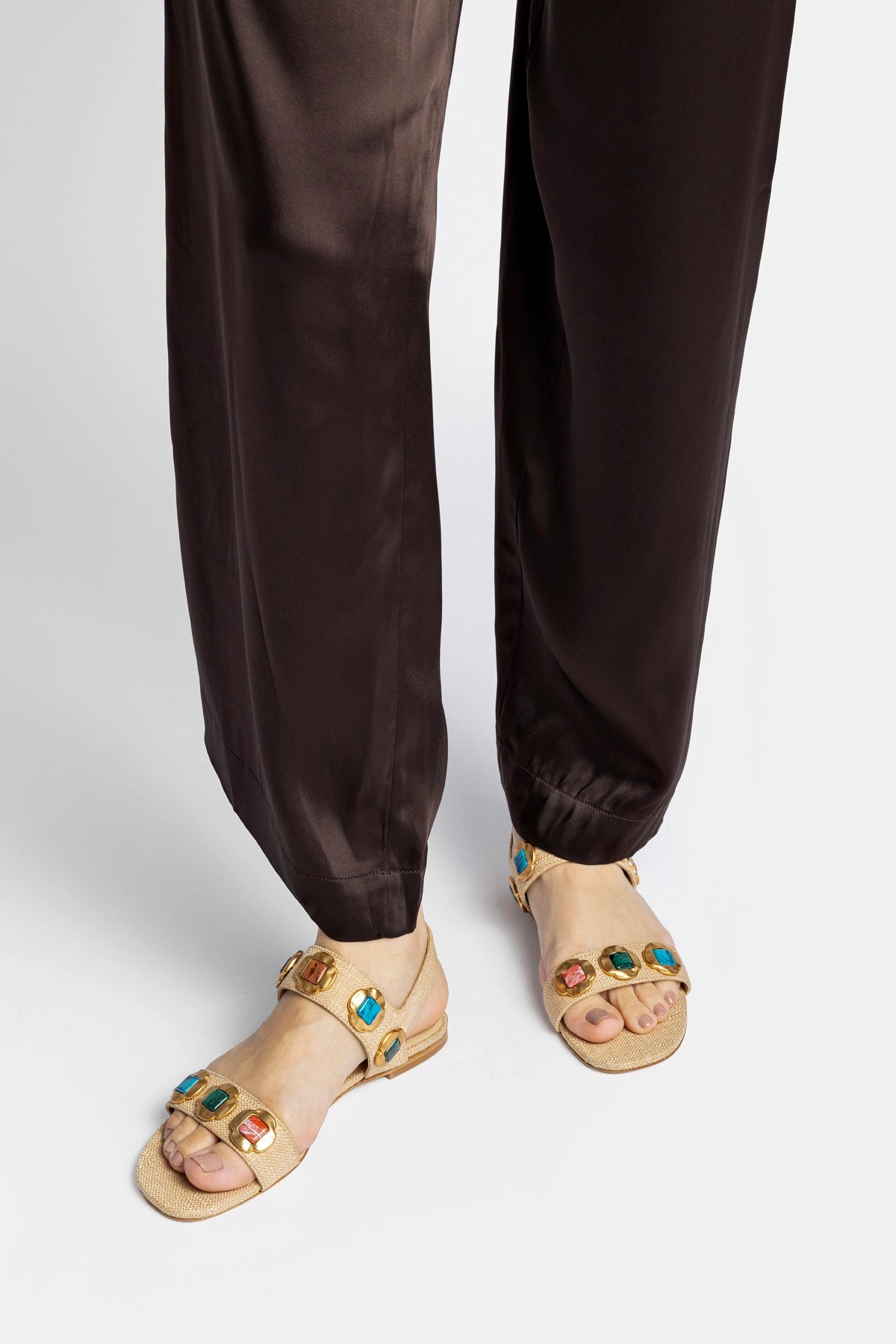 The Milan Gioiello flat blends a striking silhouette with artisan-inspired details that stand out naturally. Crafted in soft raffia, it features gold-toned accents set with colorful stones, creating a vibrant, eye-catching look.