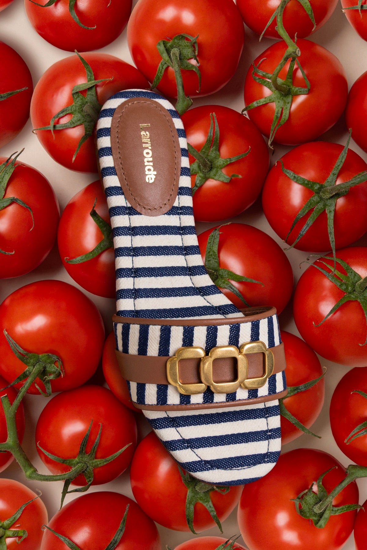 A minimalist slide that blends natural texture with a polished finish. The front strap combines soft leather with striped awning, highlighted by our signature hardware in gold metal. The result is a light, fresh look with plenty of personality.