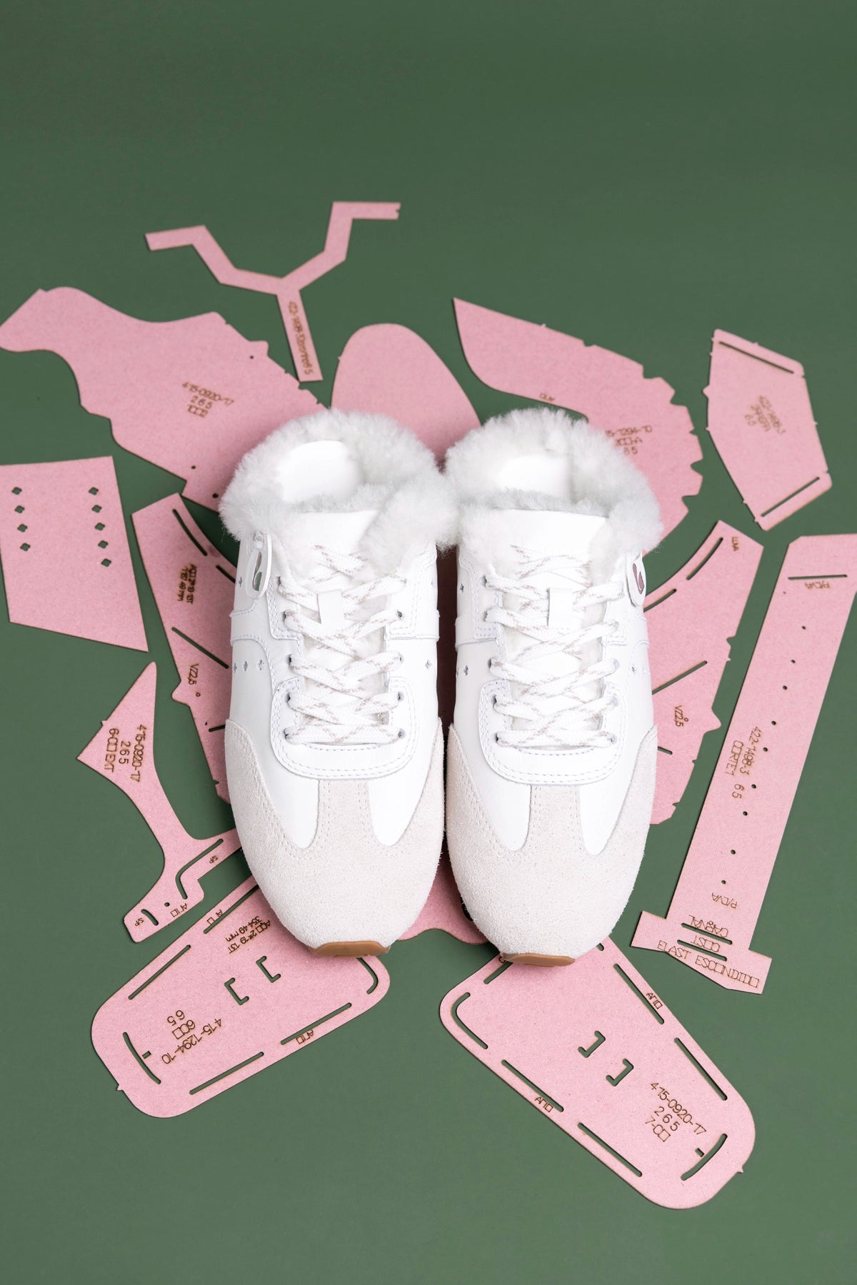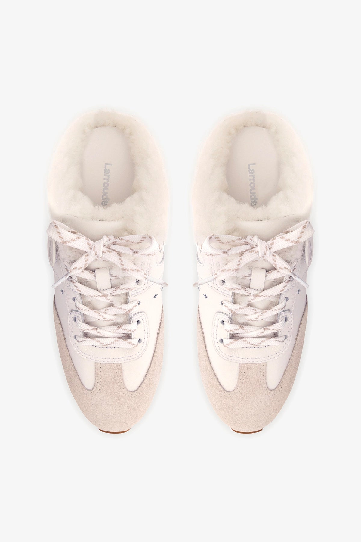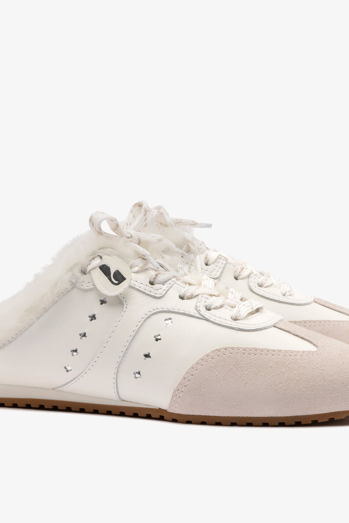Meet the coziest take on Stella sneaker. The Stella mule blends sporty design with laid-back comfort, featuring a white leather upper, grey suede accents, and plush natural shearling lining.