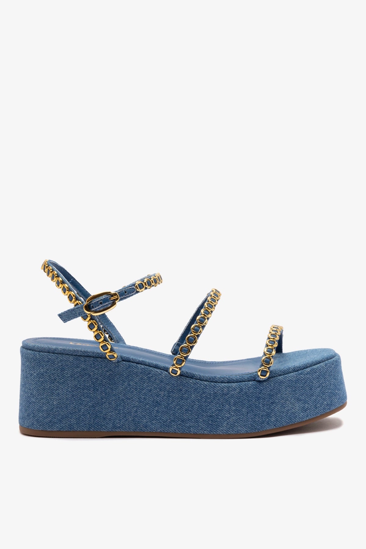 Introducing the barely-there elegance of the Gio with the of-the-moment appeal of our bestselling flatforms, this allover denim must-have is a combination of all of our favorite things with an added platform base that delivers height and appeal.