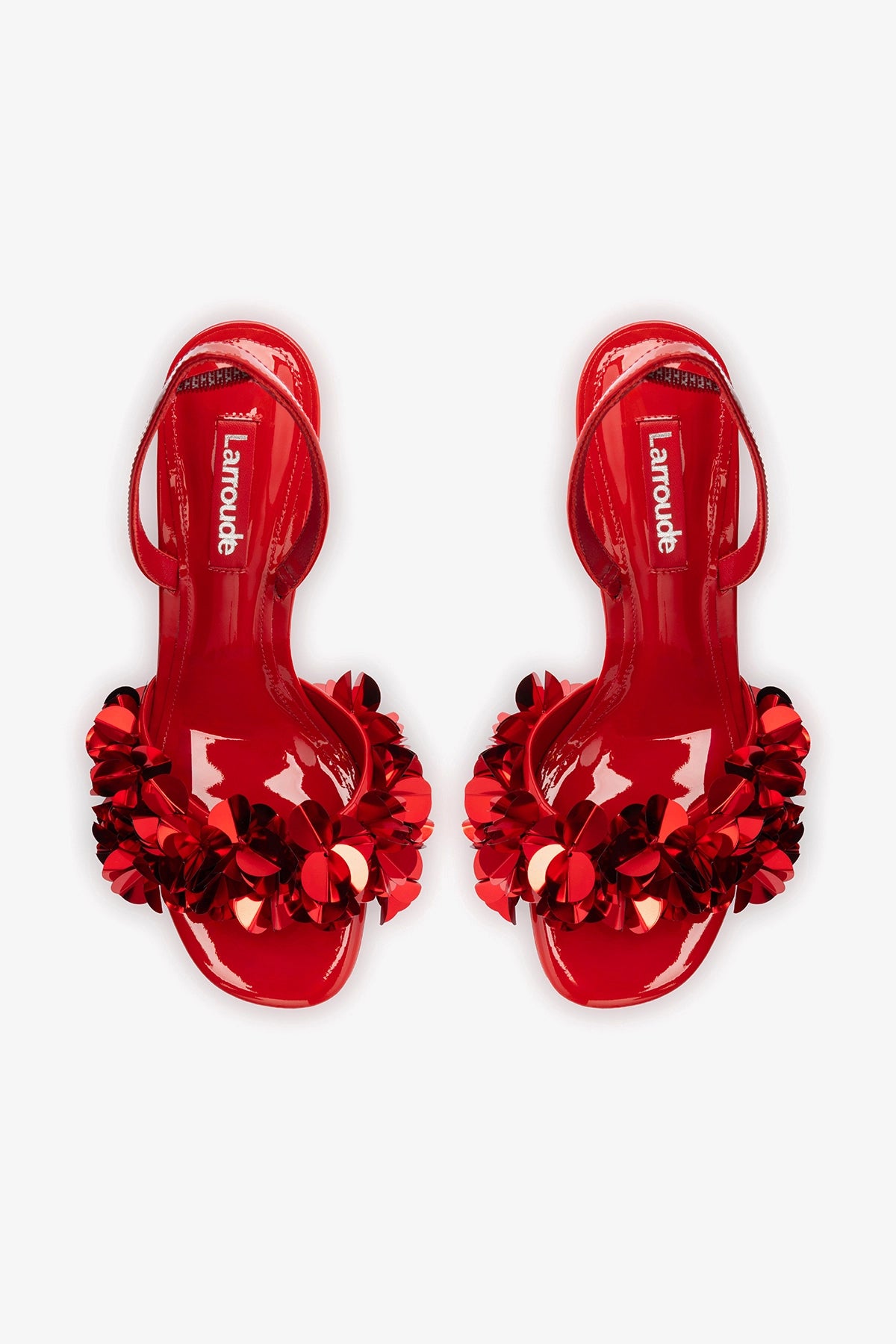 The Morgan is pure celebration: reimagined in scarlet patent with its commanding stiletto heel, it defines vibrant luxury. The voluminous sequin appliqués are the statement that transforms this sandal into the essential piece for shining brightly.