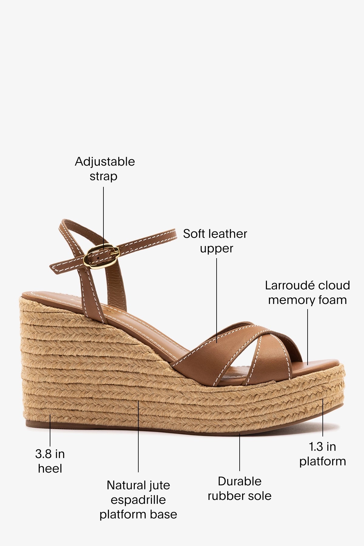 Platform espadrille wedge sandal featuring a natural jute sole and a leather upper. The strappy design offers a secure fit, while the wedge heel provides height with comfort for all-day wear.