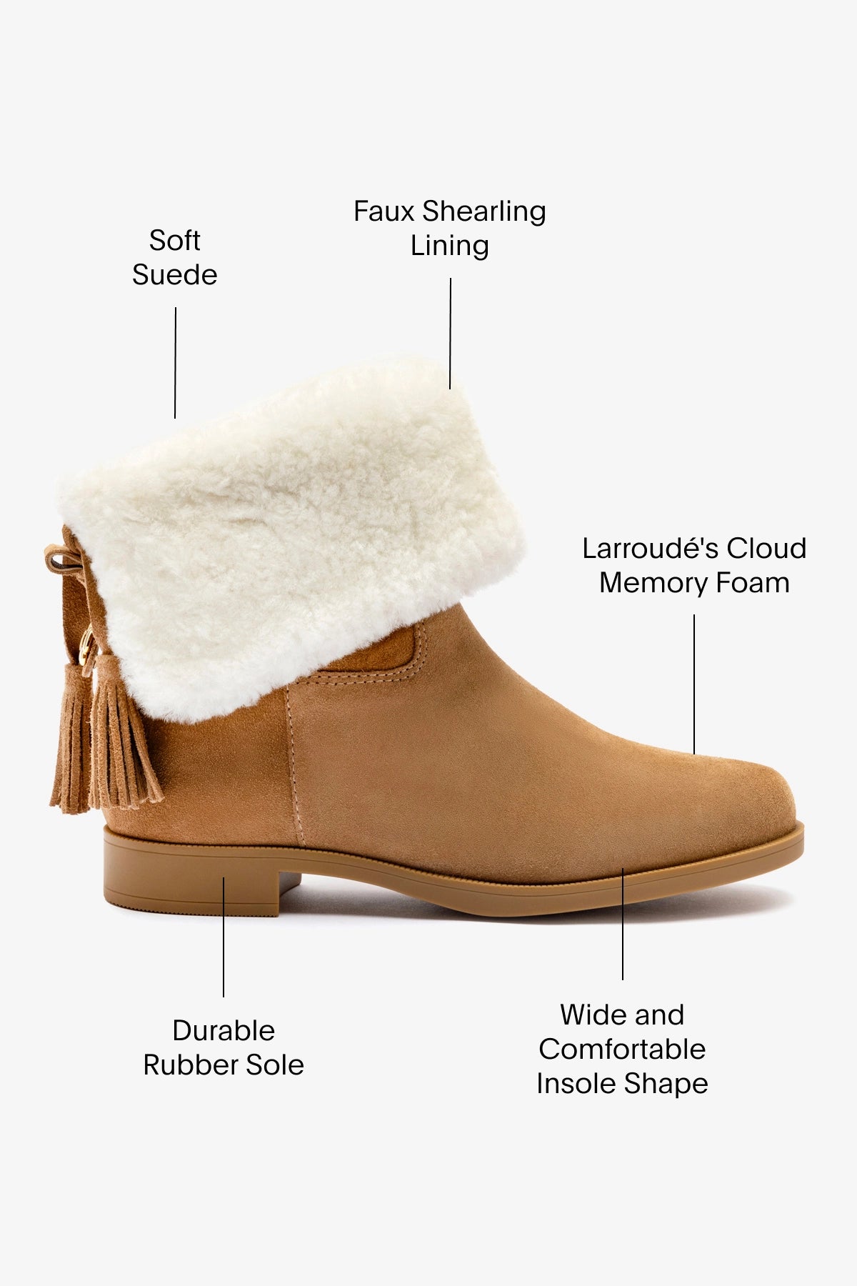 Inspired by alpine escapes, the Verbier boot blends cozy textures and understated elegance. Made from soft caramel suede with exposed natural shearling lining, it's the ultimate cold-weather companion — warm, stylish, and endlessly versatile. The folded short shaft and tassel detail bring movement and charm, making it perfect for pairing with winter denim, chunky knits, or sweater dresses and tights.