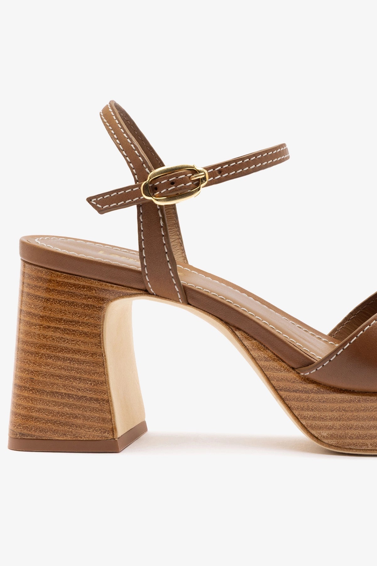 Low block-heel platform sandal crafted from caramel leather, featuring a wood-effect heel and visible stitching on the straps. The platform design offers comfort and stability, balancing everyday ease with thoughtful detailing.