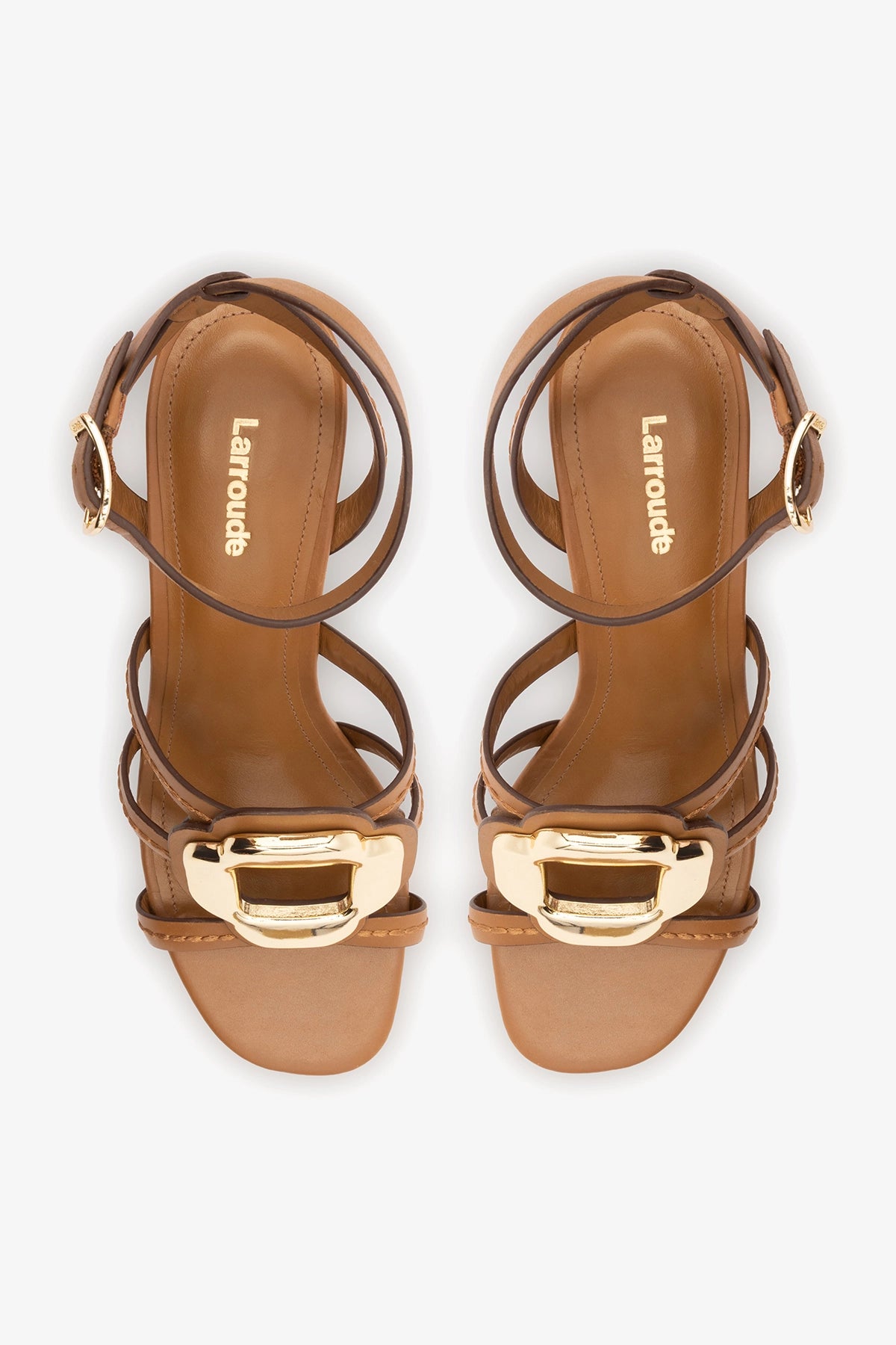 Block-heel sandal crafted in smooth caramel leather with slim straps and visible stitching details. Features oversized gold-tone hardware across the upper, adding a bold statement element, while the structured block heel ensures stability and comfort.