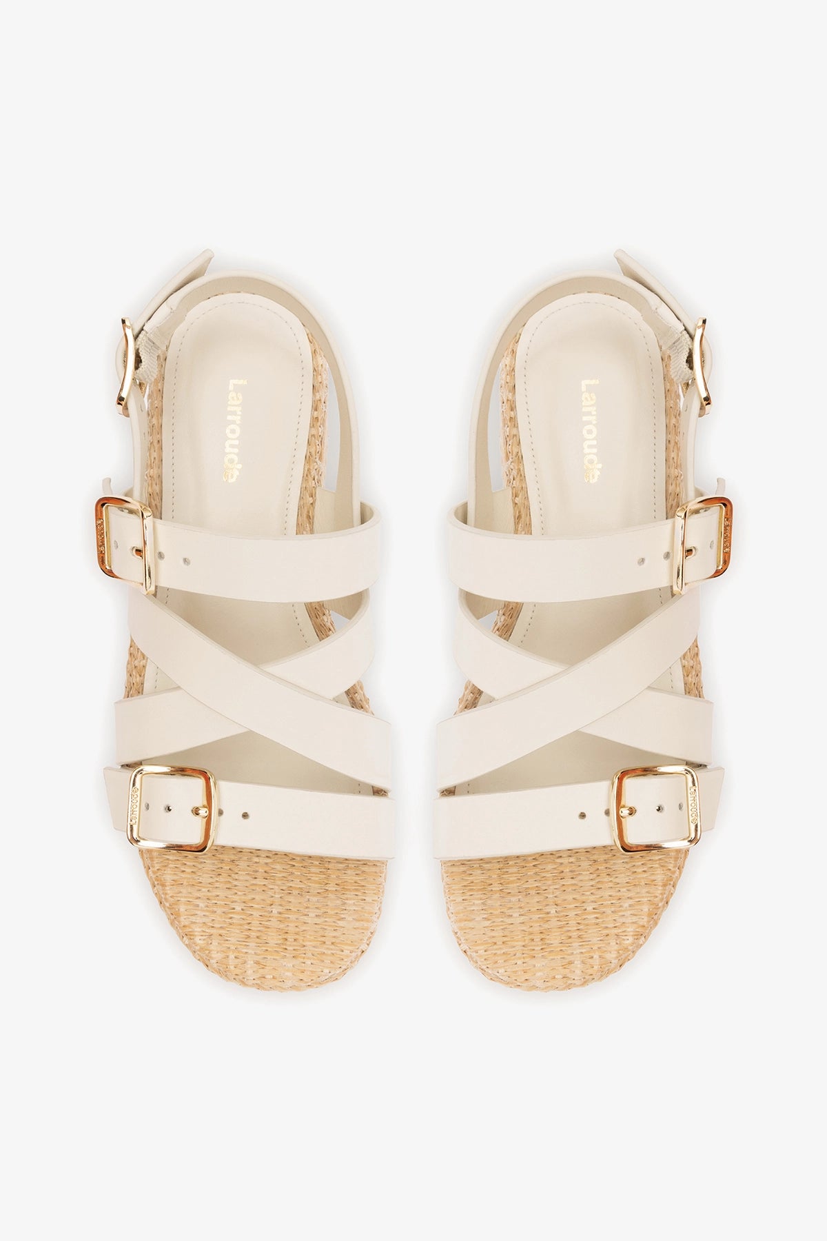 Flatform sandal crafted in ivory leather with wide crossed straps and adjustable buckle closures. The raffia-wrapped platform sole adds texture and a natural finish, while the flat construction ensures stability and comfort for all-day wear.