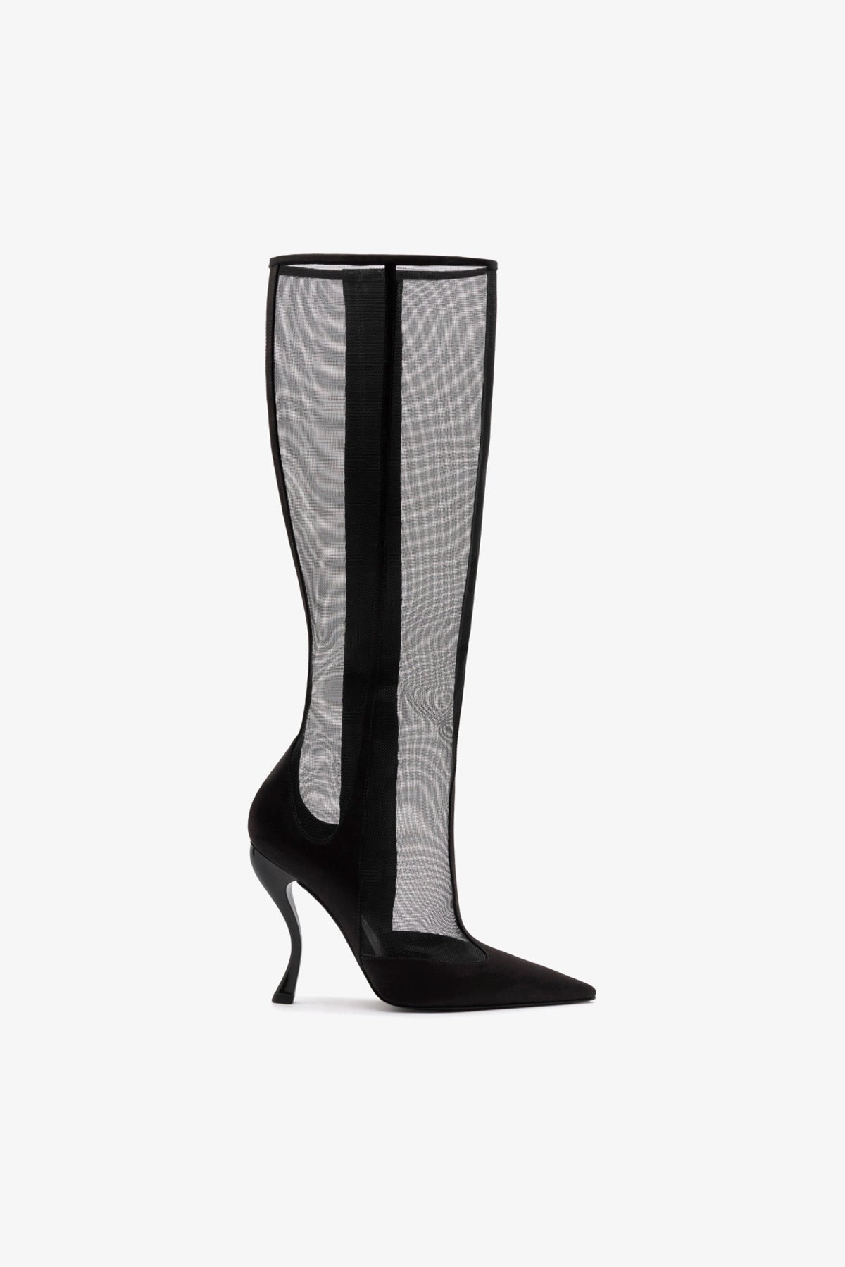 The architectural lines of young Italian designer Nicoló Beretta meet the creativity of Larroudé in an exclusive collaboration. The Zuzu is the perfect fusion of the timeless elegance of black satin and the sensuality of transparent mesh. The tall shaft hugs the leg like a second skin, while the pointed toe and sculptural heel complete the powerful and dramatic silhouette.