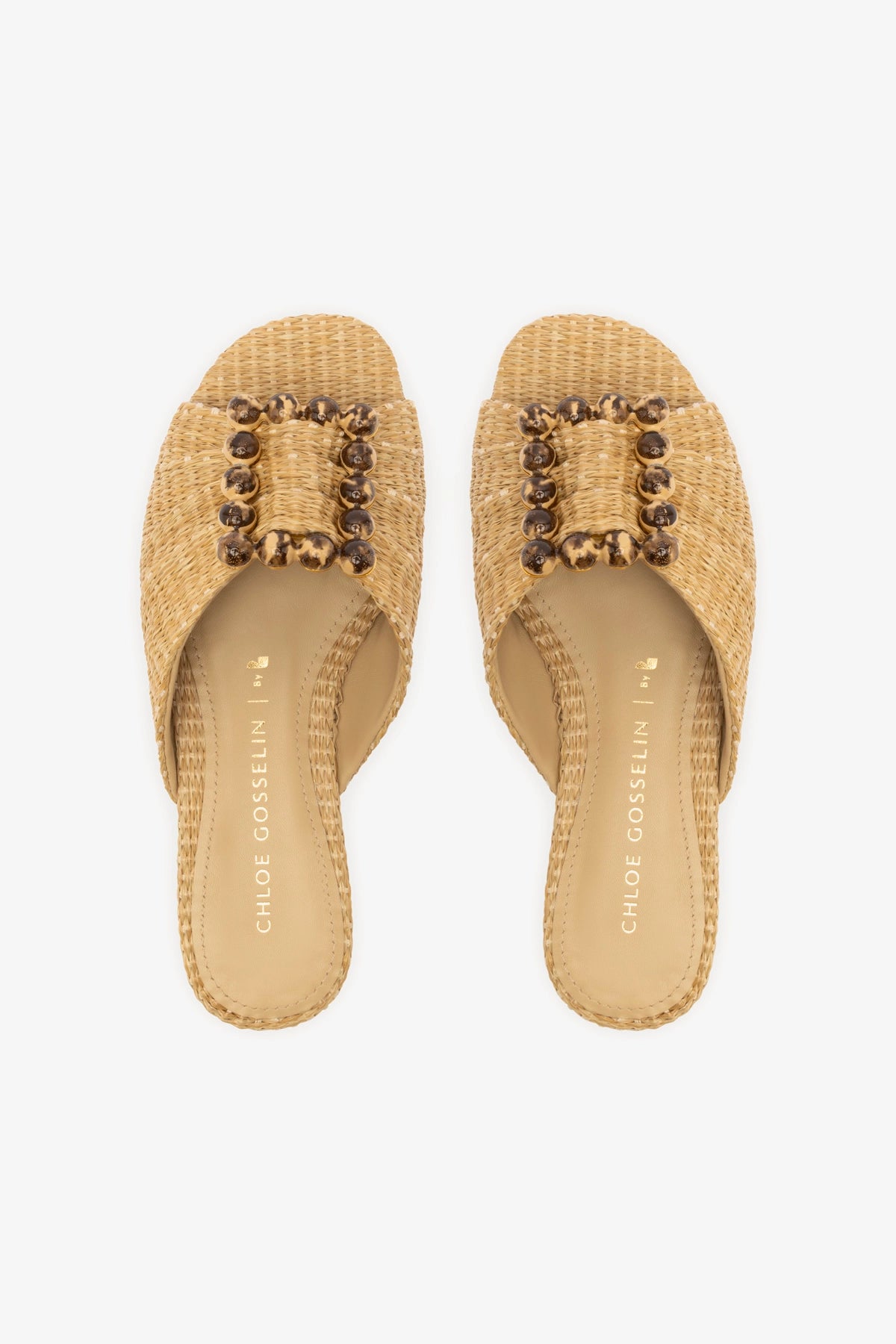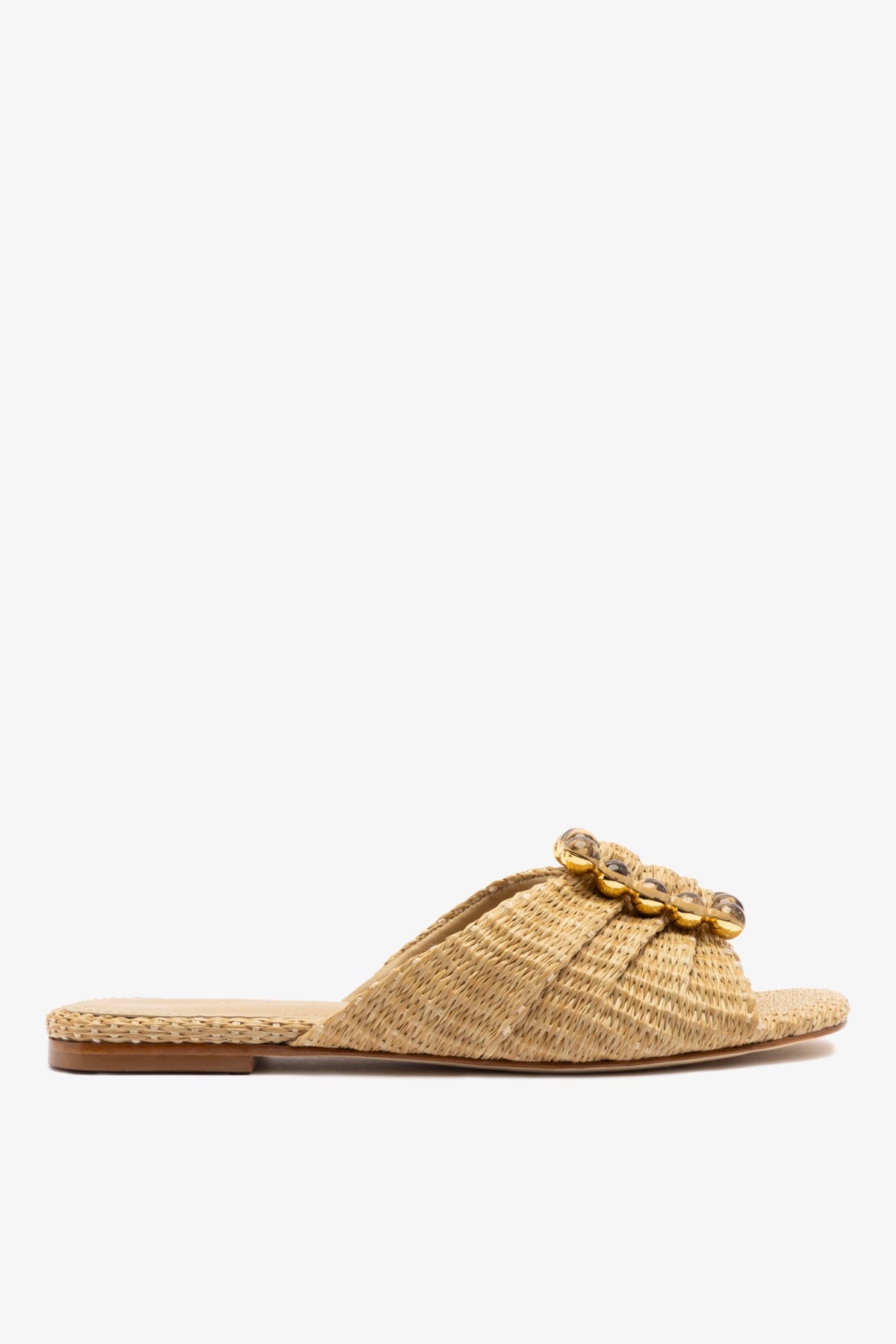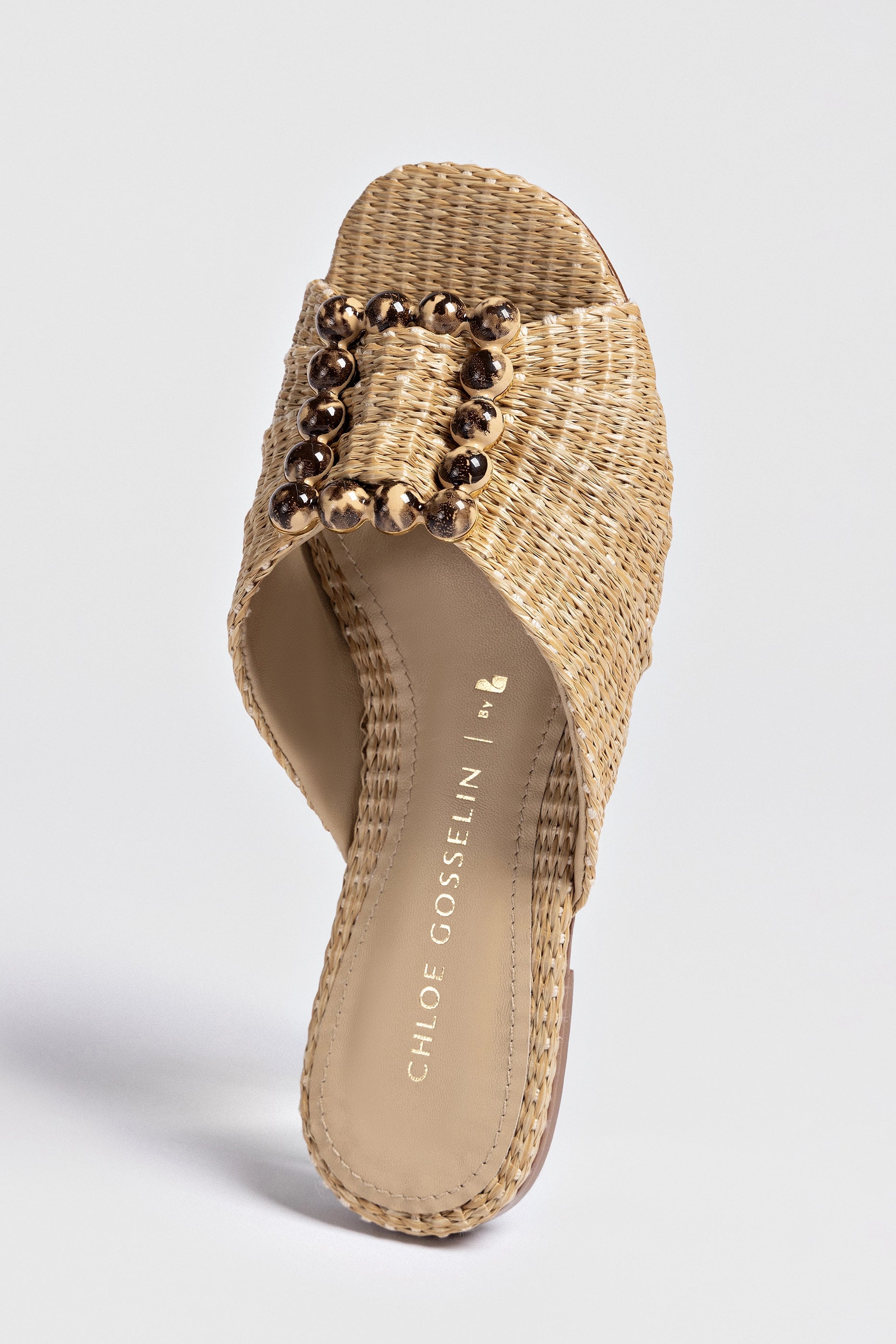 Part of our new concept, this Chloe Gosselin by Studio Larroudé classic slide takes cues from the designer's singular aesthetic. Adorned with eye-catching metal and stone hardware affixed on the gathered raffia, this classic flat can be dressed up or down, day or night.