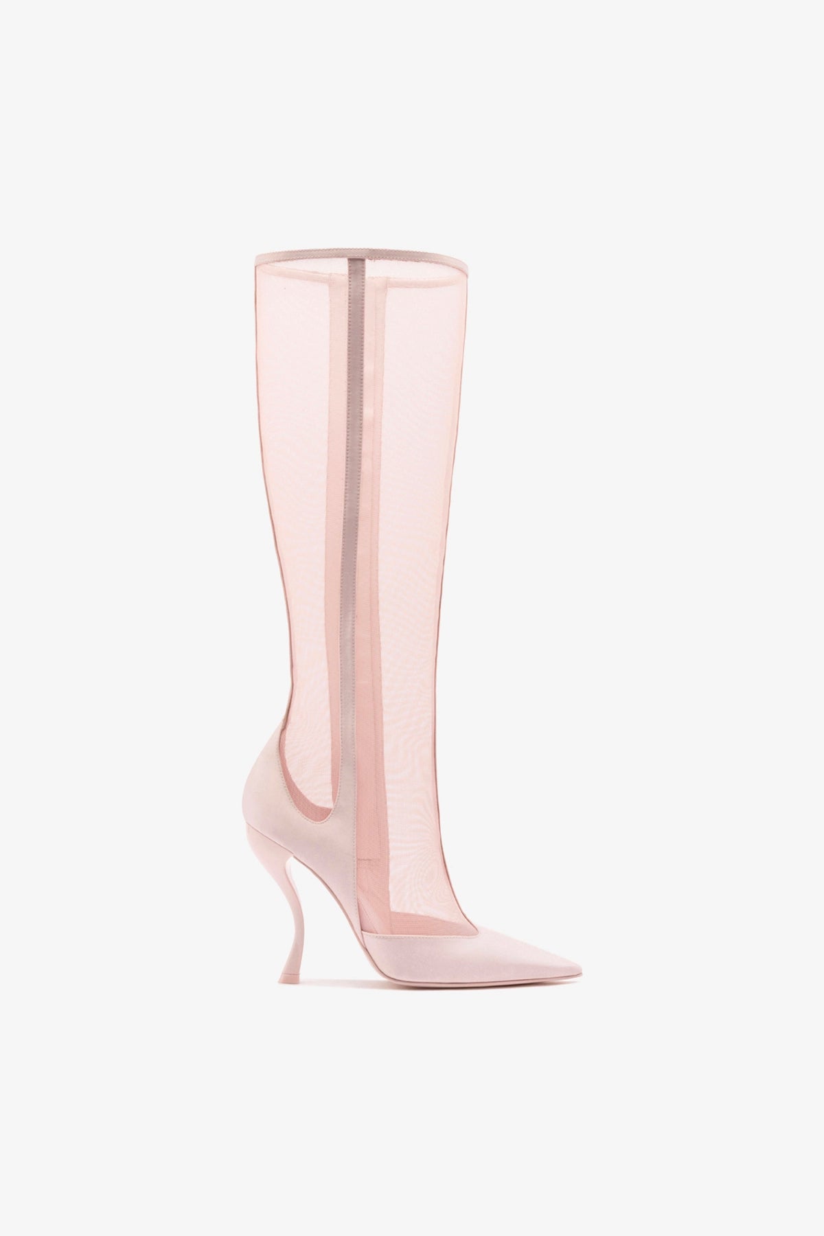 The architectural lines of young Italian designer Nicoló Beretta meet the creativity of Larroudé in an exclusive collaboration. The Zuzu is the perfect fusion of the timeless elegance of black satin and the sensuality of transparent mesh. The tall shaft hugs the leg like a second skin, while the pointed toe and sculptural heel complete the powerful and dramatic silhouette.